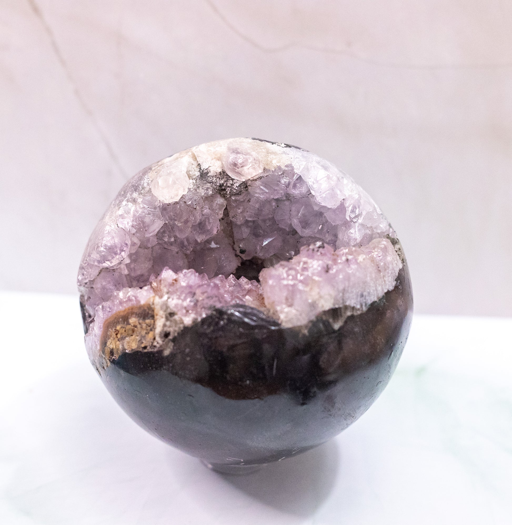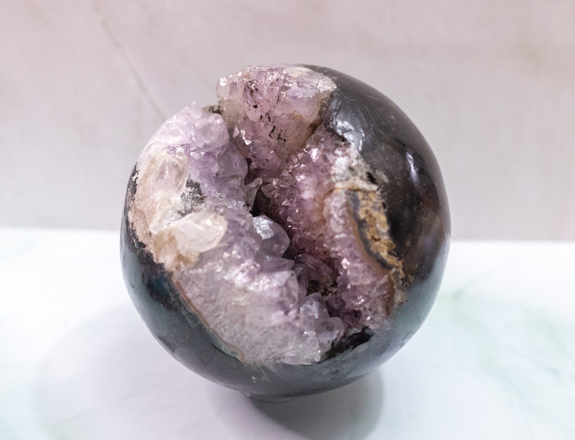 This striking Black Amethyst Sphere blends the tranquil energy of amethyst with grounding smoky undertones. đź–¤