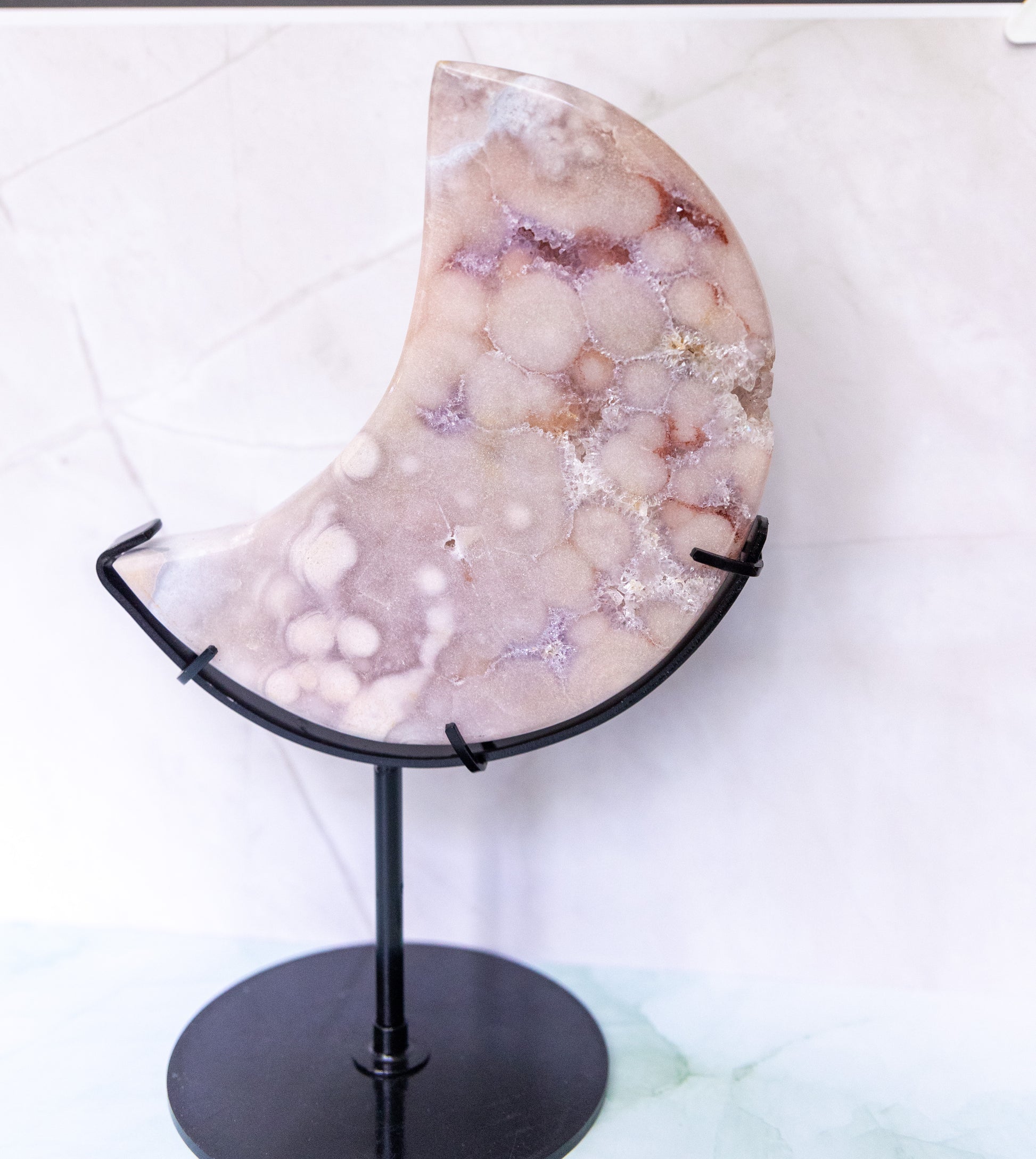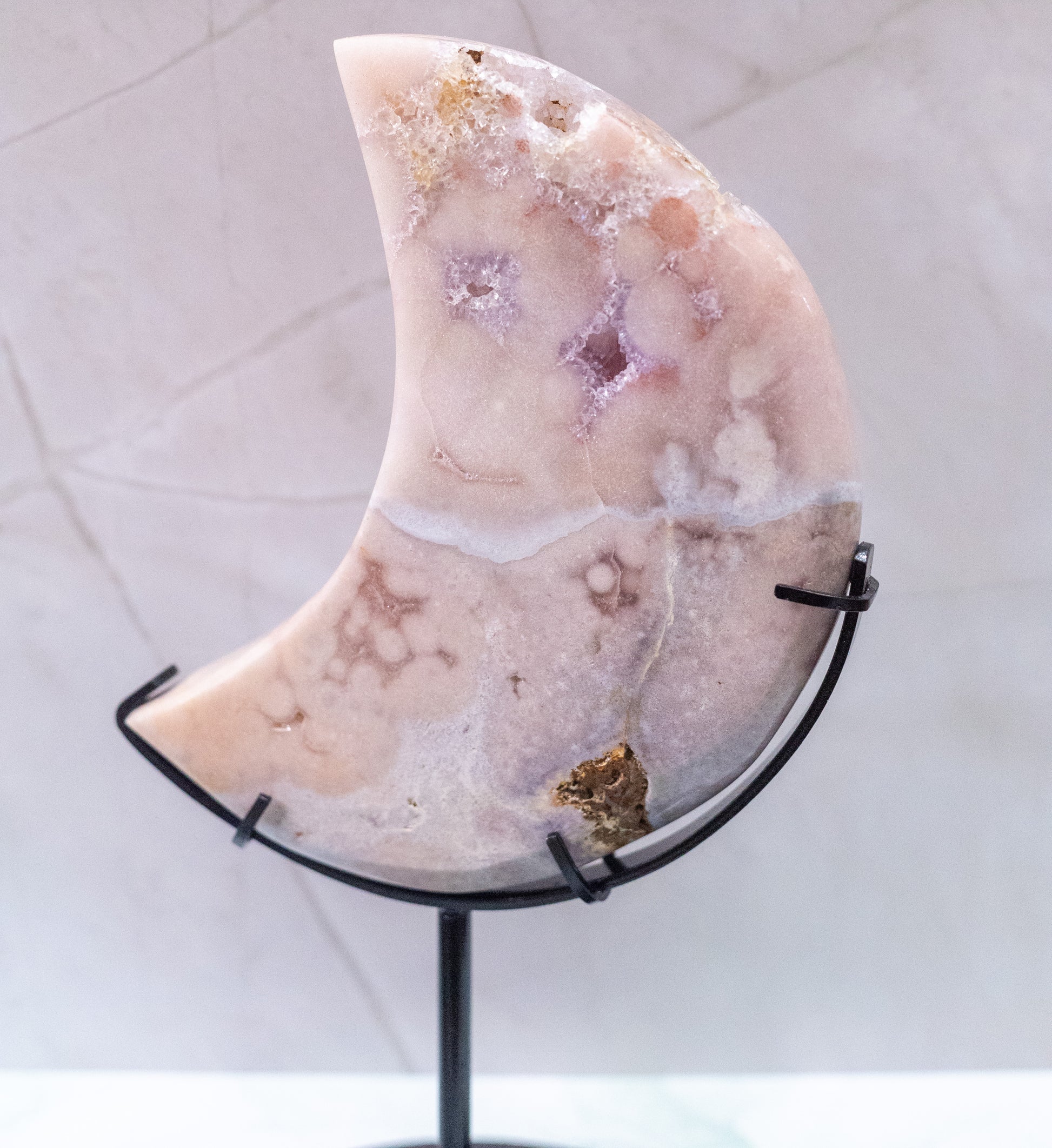 Each moon is one-of-a-kind and rests on a sleek metal stand, with divine druzy pockets making it a perfect centerpiece for your space.